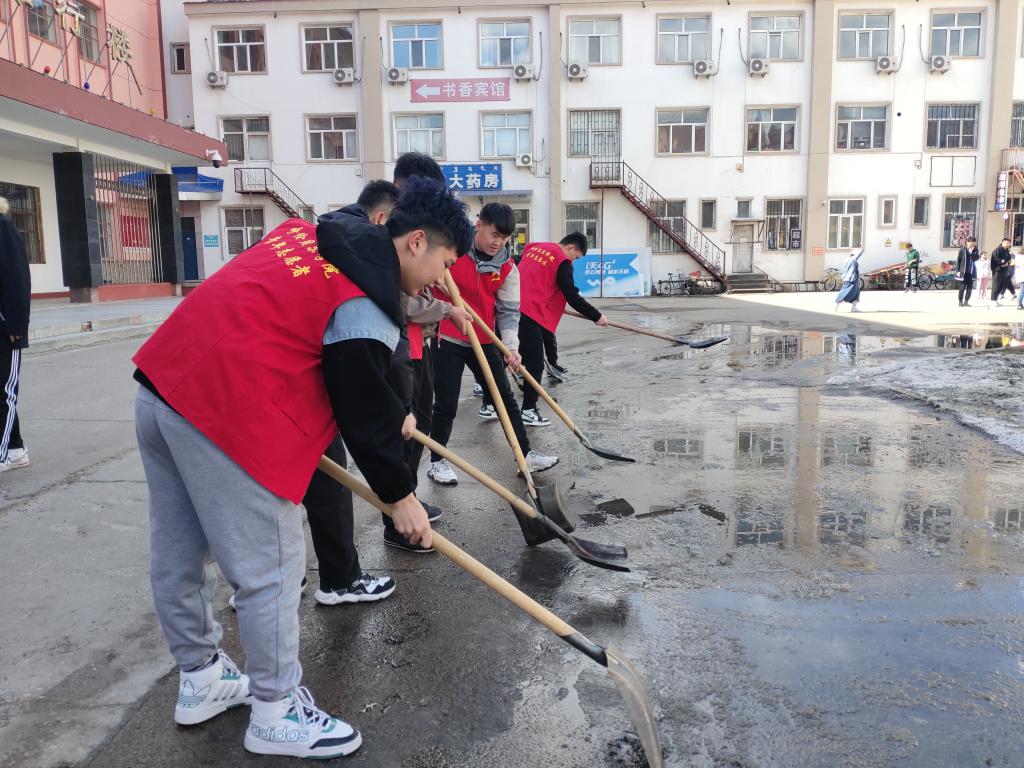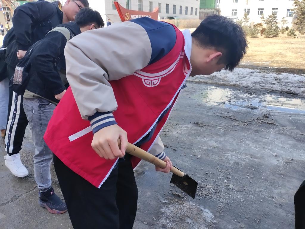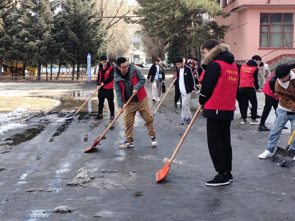 由于知行楼附近的下水道向地面反水,昼夜温差大,导致地面结冰,给同学们上下课带来隐患。青年志愿者和员工干部们一起拿着除雪铲、铁锹、扫帚等工具,将知行楼前方甬路的积雪清扫干净,为同学们的上下课保驾护航。