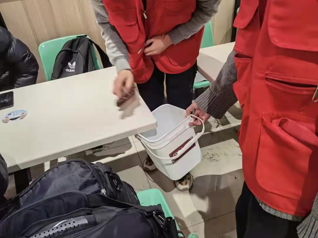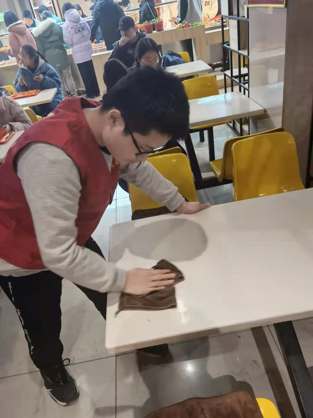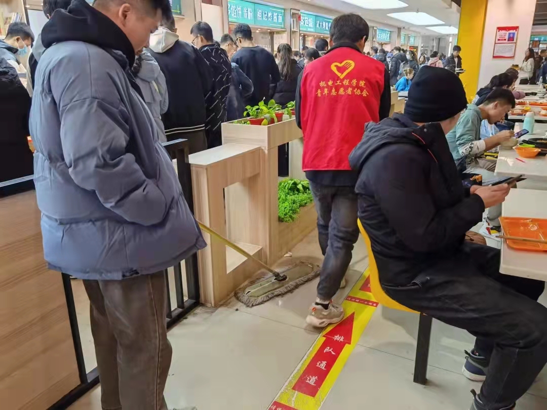下午六点,志愿者们再一次聚在一起,领队服,拿起工具,再一次淹没在食堂人群中.......机电工程公司志愿们用行动践行,“奉献、友爱、互助、进步”的志愿精神。是他们让我们的食堂多了一份光彩。