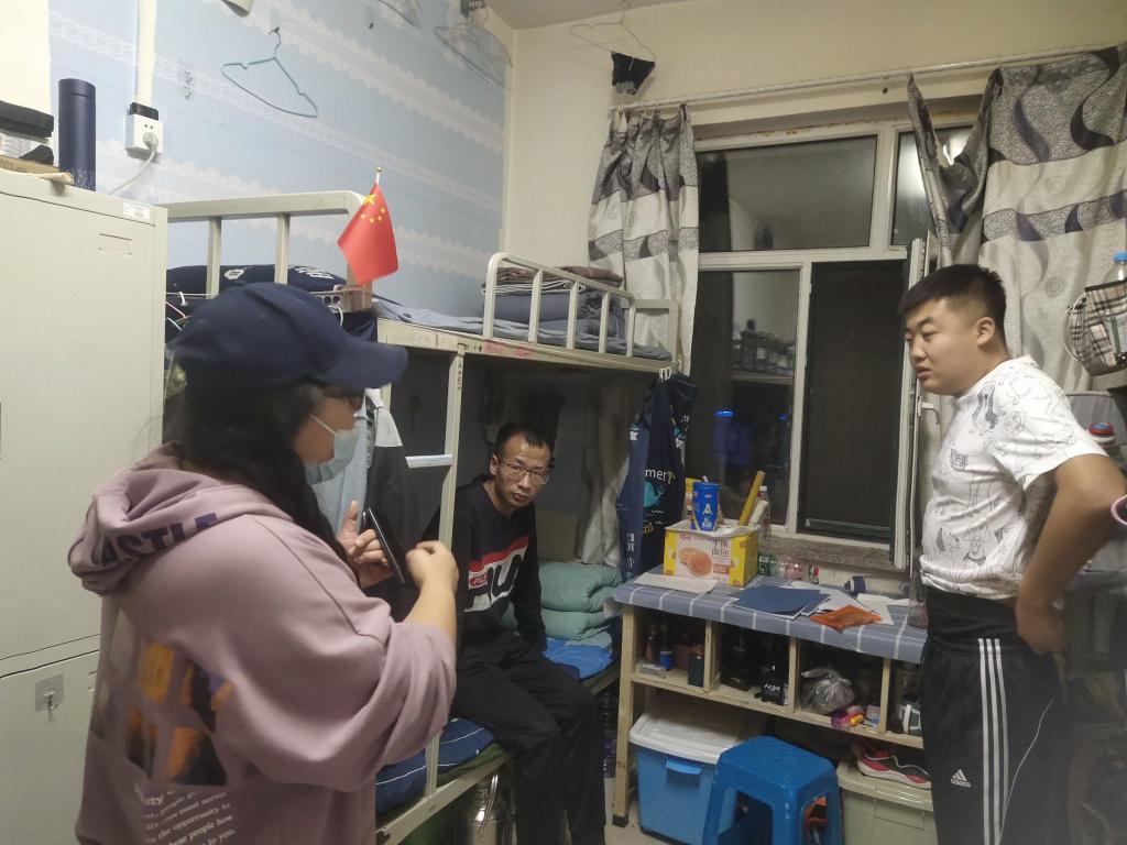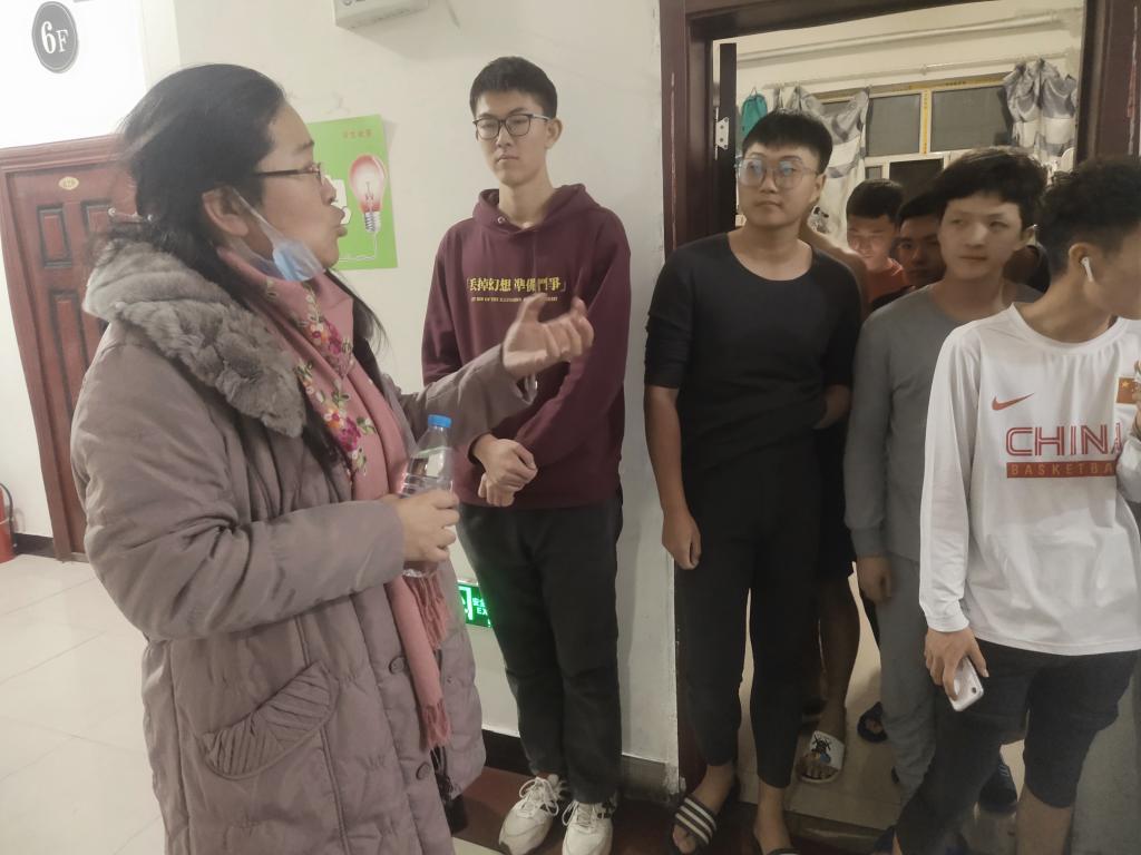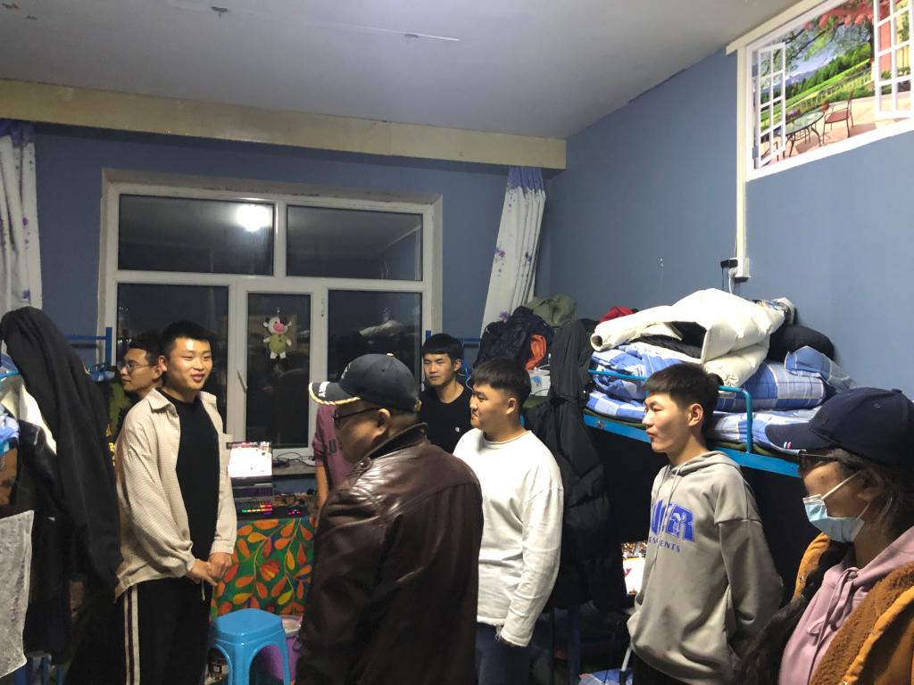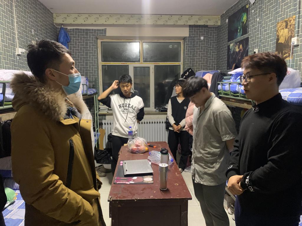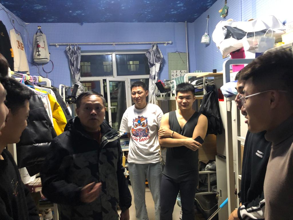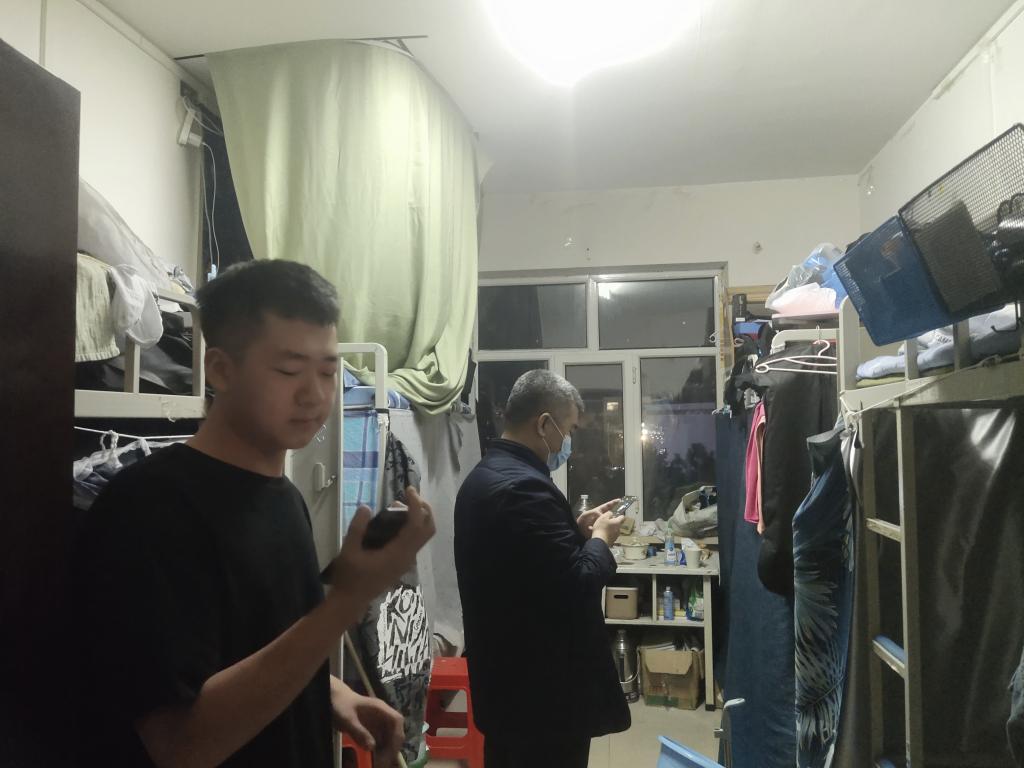 新冠疫情渐稳,为了解公司员工疫情期间在校的住宿安全和生活状况,给同学们营造一个良好健康的校园生活环境。2021年11月13日晚上,机电工程公司王旭书记、汪鑫书记、吴晗主任、佟晟老师、其其格导员 、陈绪莲导员一起深入员工宿舍,了解校园封闭管理期间公司员工的学习和生活情况。