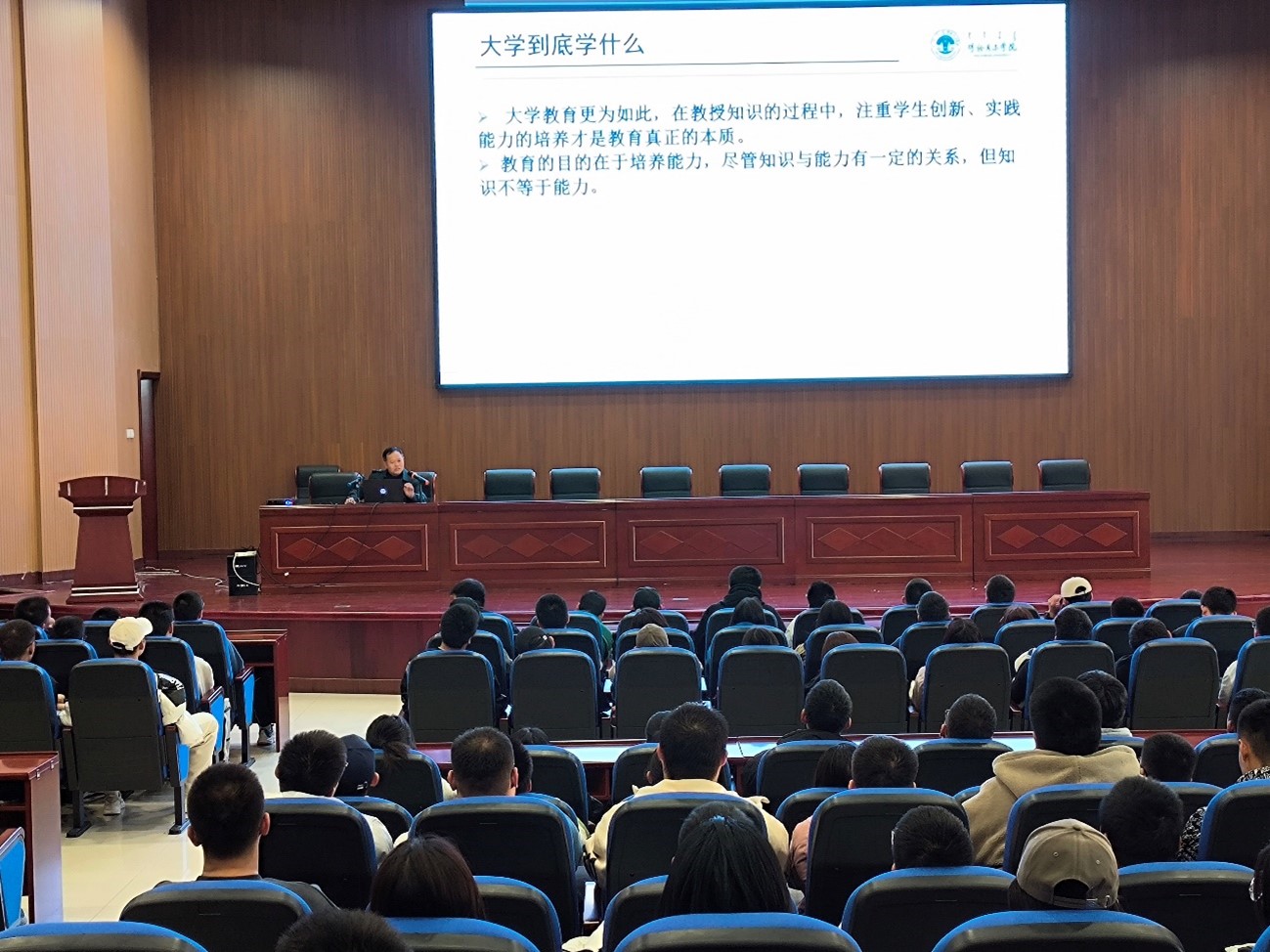 王旭从近几年老员工的就业形势作为本次讲座的切入点,从老员工对自己的人生定位、大学应该学什么、老员工良好习惯的养成等几方面,以生动的语言、丰富的案例,旁征博引、深入浅出地进行了讲解,多次引起同学的共鸣。大学是人生的重要阶段,在讲到一个人应具有的知识素养时,他表示,一个人最能经得起岁月摧残的,就是他的才华;在讲到一个人应具备的人文素养时,他强调,每个人的言谈举止中,透露出他读过的书、走过的路、遇到的人、见过的风景,体现出一个人的格局和修养;在谈到高素质人才应具备的智慧力、意志力和道德力时,又从感恩、诚信、博爱三个方面,诠释了良好的道德品质对一个人人生的影响。讲到如何适应老员工活时,他指出,老员工活的特点与高中不同,自习多、老师管的少、没有固定的教室、学习内容多、课讲得快等,这些与高中时期的不同都是大家需要去适应的。他表示,在大学还会出现心情焦虑、紧张,感觉赶不上老师的讲课思路,不能有效支配时间,与理想大学差距大,产生失落感或者与同学交往性格有差异,感觉格格不入等现象。但是作为一个老员工,我们不可能改变一所大学,只能改变自己,学会适应,要有自己明确的目标。有些东西是相对的,最好的大学也有最差的员工,最差的大学也有最好的员工,希望同学们珍惜大学时光,做最好的自己。