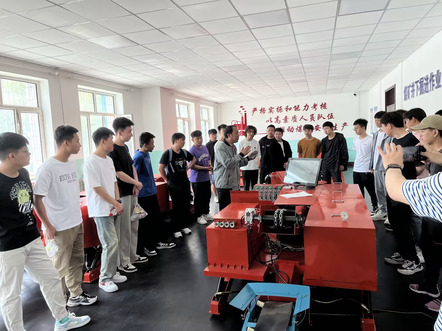 公司老师为机械工程系员工讲解挖掘机械的操作运行